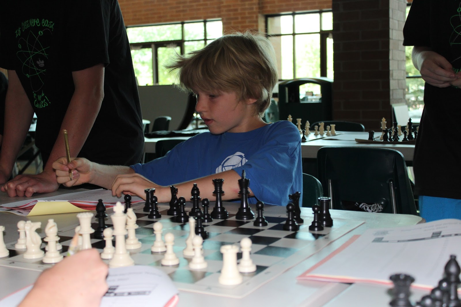Darwin, my son, impressed me with his seriousness during the week. He brought his own chess set each day and would set up at a lone table and would quietly sit until a competitor would sit down. On this day, Jon Reigle, a former chess student from my class, sat down for a game. It was clear that he was going to promote his last pawn but Darwin had a little surprise.